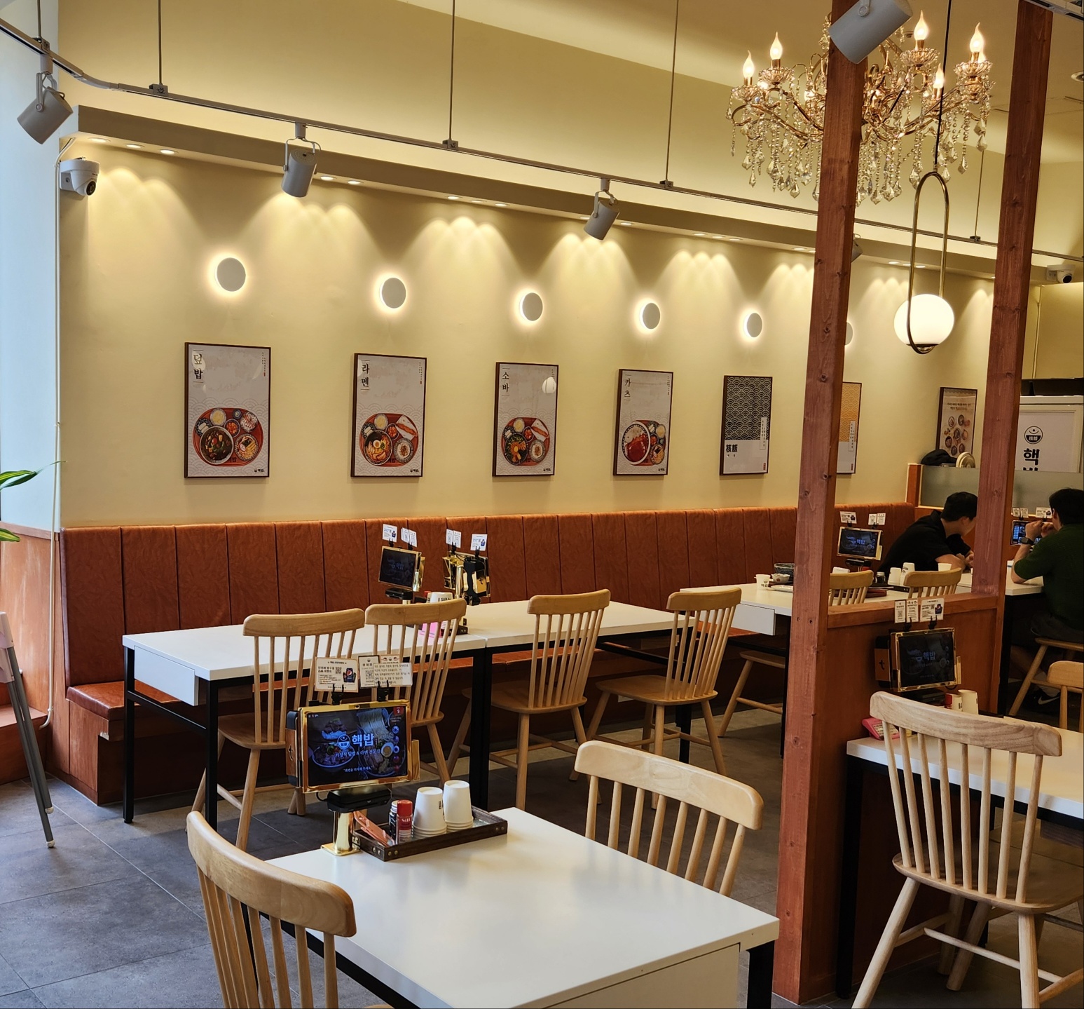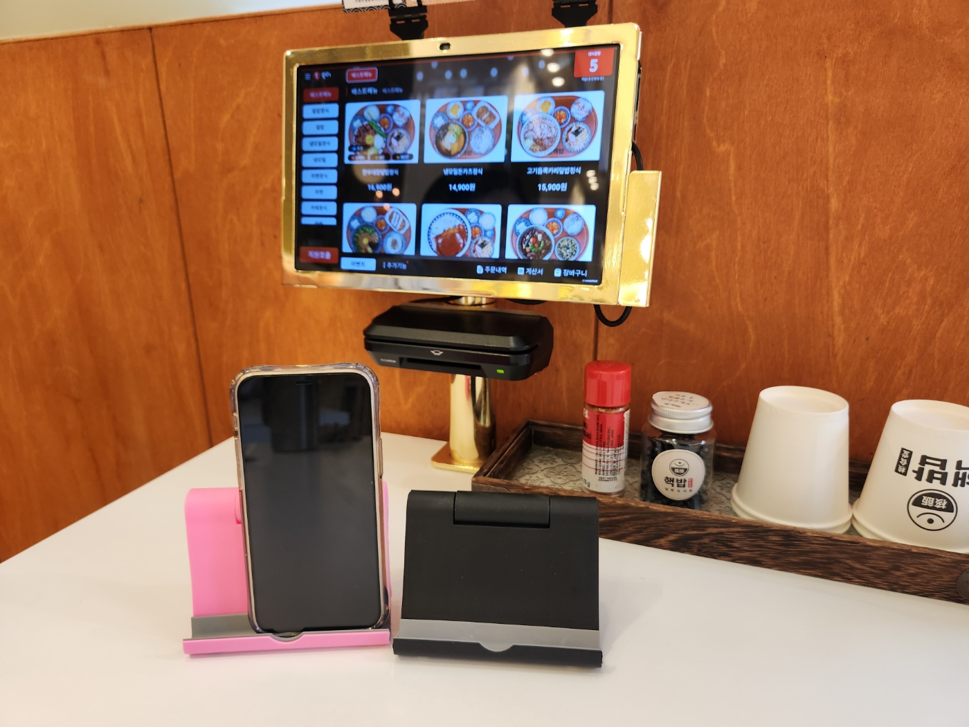 테이블마다 키오스크가 설치되어 있어서 주문과 결재가 무척 편리하고 핸드폰 거치대, 긴 머리 여성들을 배려한 고무줄까지 소소한 고객서비스 눈에 보입니다