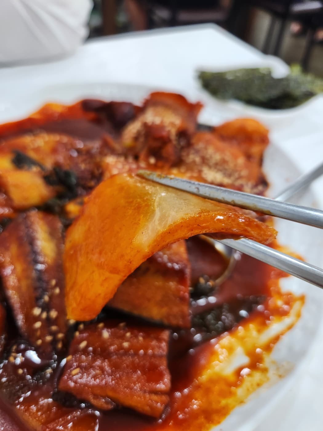 졸깃한 식감과 적당한 단맛 그리고 적당한 매운맛이 식욕을 자극했고 무엇보다 반건조 생선과 함께 요리된 무, 고구마, 대파 등과 같은 야채들에 양념이 잘 스며들어져서 정말 맛있었습니다