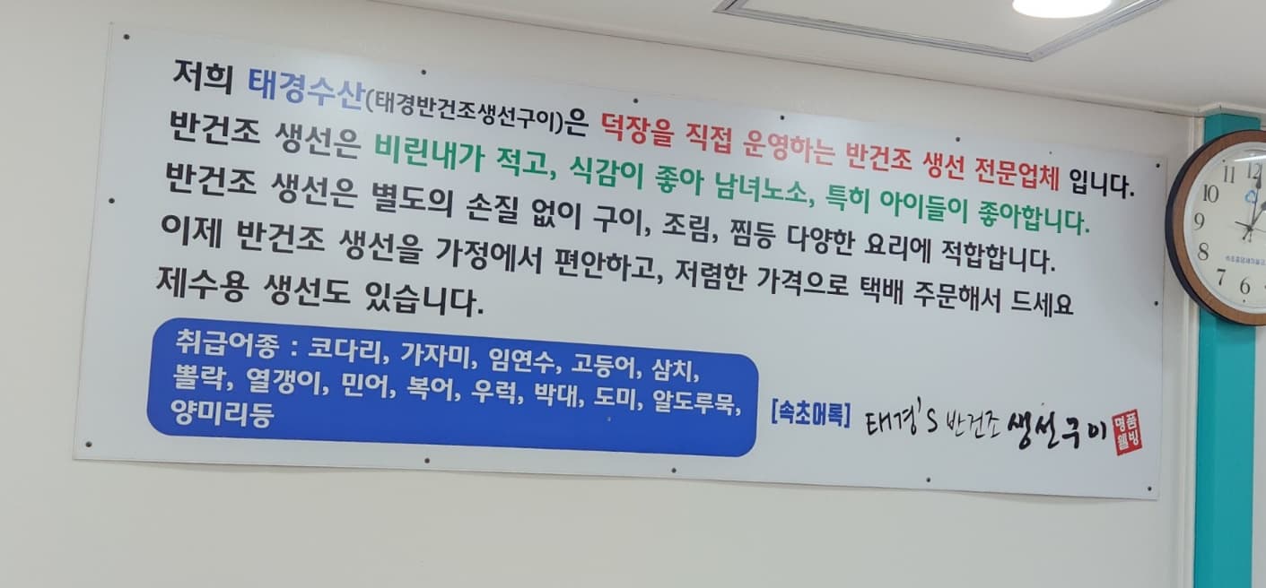 | 취급어종 | 가자미, 임연수, 고등어, 뽈락, 서대, 삼치, 조기, 코다리, 민어, 알도루목, 양미리 |