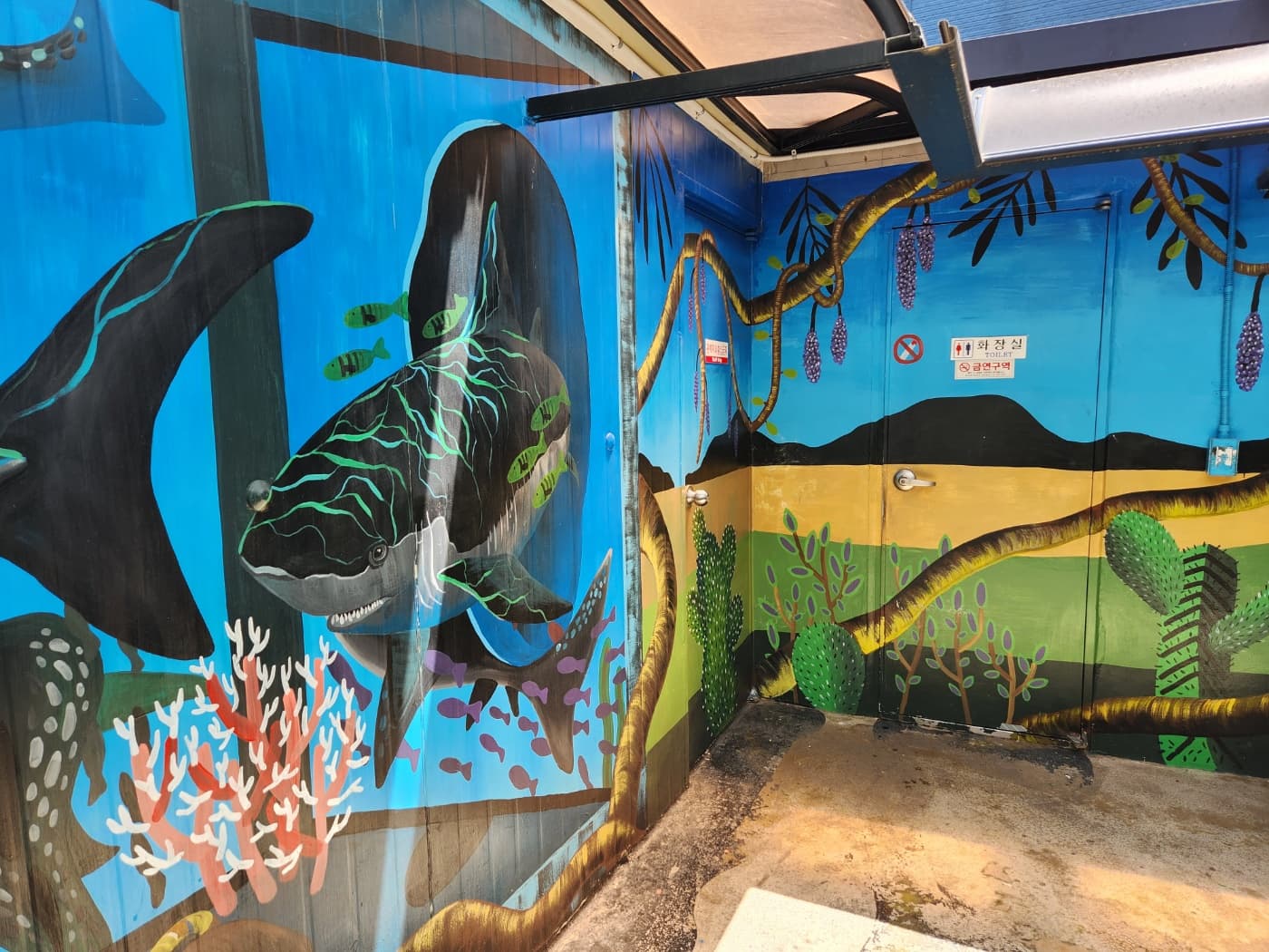 정갈한 매장 분위기와 바닷속을 그려놓은 이색적인 벽화가 인상적입니다