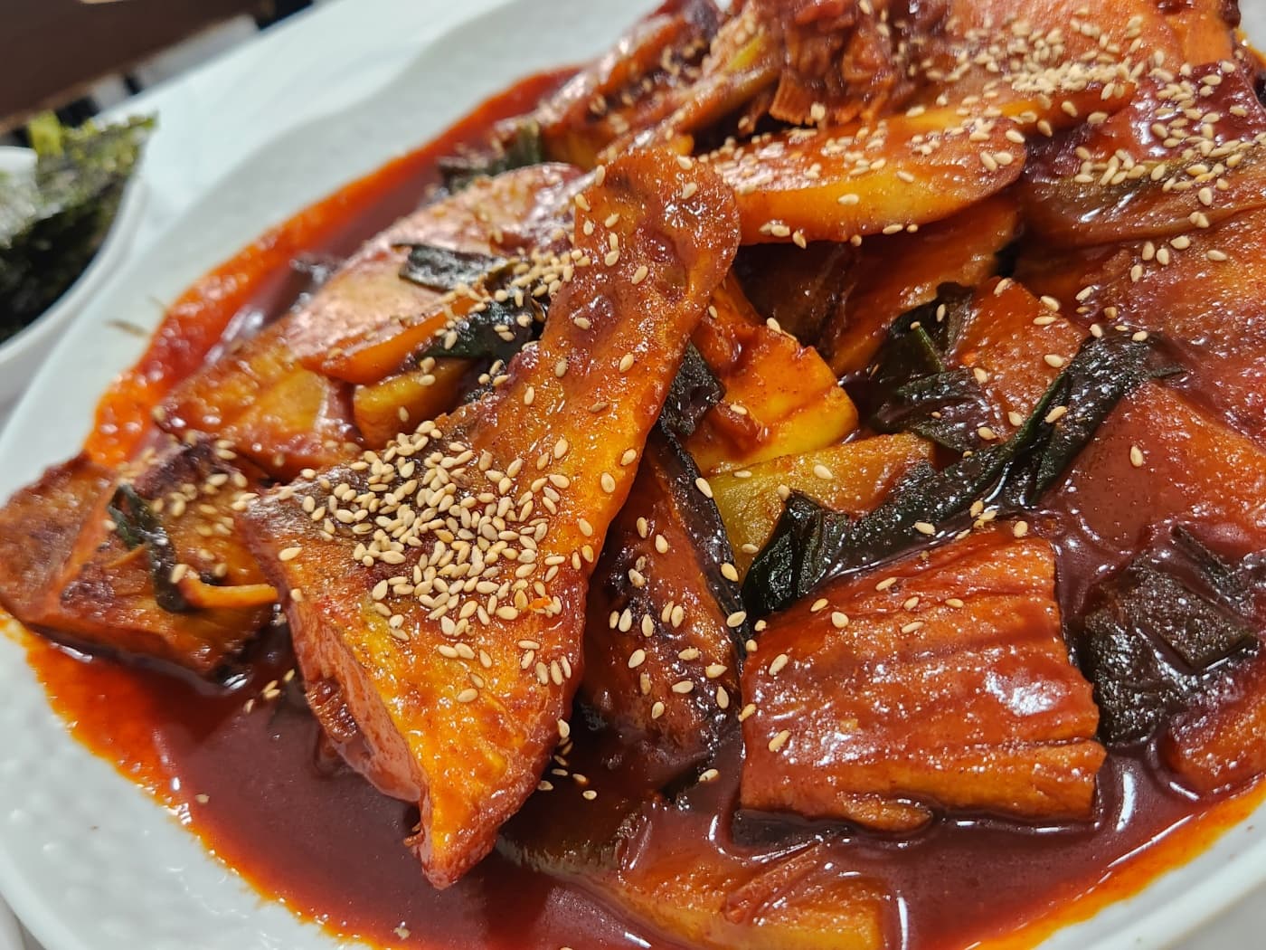 졸깃한 식감과 적당한 단맛 그리고 적당한 매운맛이 식욕을 자극했고 무엇보다 반건조 생선과 함께 요리된 무, 고구마, 대파 등과 같은 야채들에 양념이 잘 스며들어져서 정말 맛있었습니다
